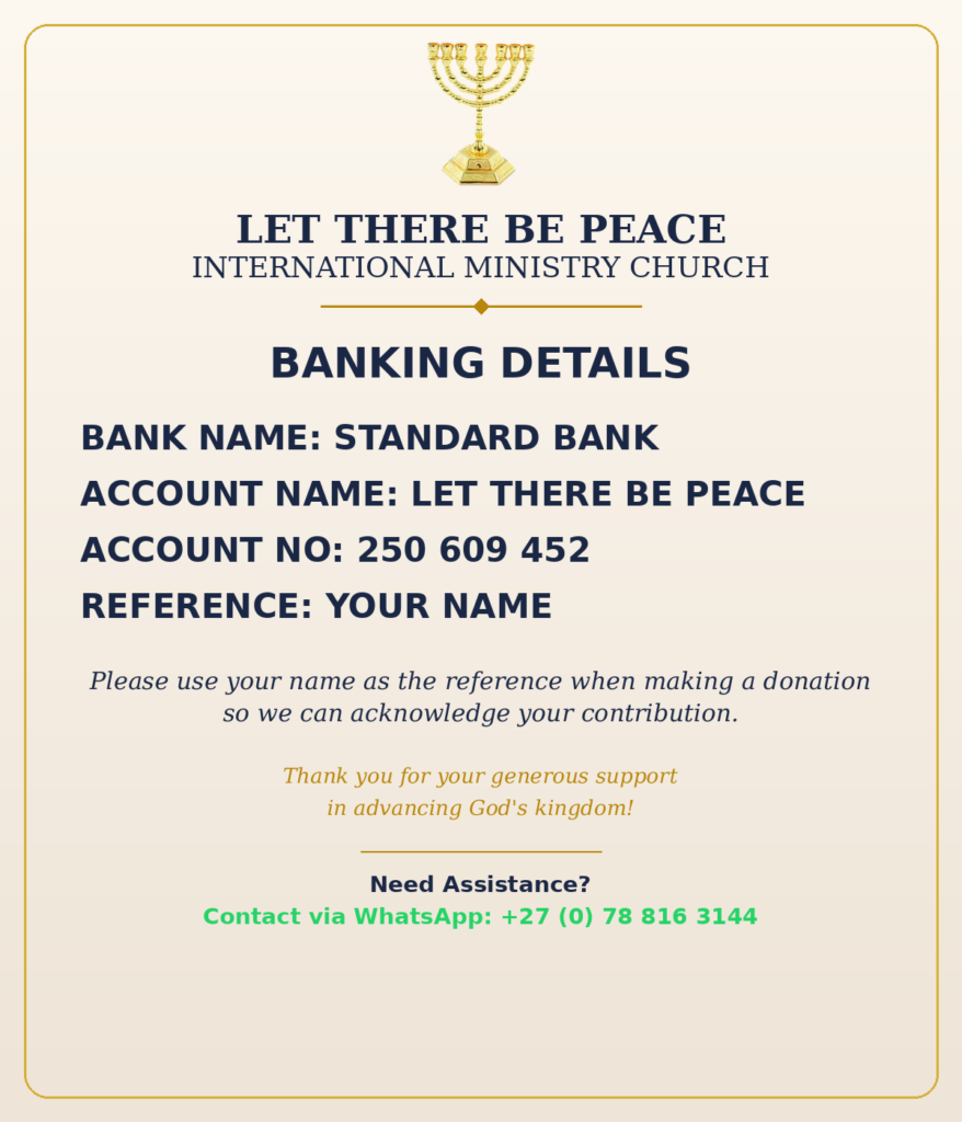 We always want the best from God, therefore when you give, you should plant the best seed you have. When you give, you are planting seeds that will be multiplied back unto you. Partnership is the decision to give God your best. Your monthly gift of R500.00 or more will support Let There Be Peace International Ministry team as a whole, and humanitarian aspects of the ministry.